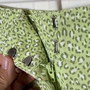 Super cute and perfect for Spring/Summer weather. Pretty green background with a leopard style gray and white print, front zipper with clips. Above the knee skirt.