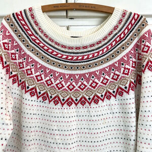 Talbots Women's Sz L Lambs Wool Blend Sweater Fair Isle White Red