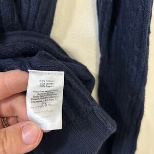 Talbots Womens Sz Large Navy Blue Cableknit Turtleneck Sweater Basic Preppy. 60% cotton, 20% nylon and 20% rayon. It measures 22 inches from armpit to armpit and the length from shoulder to hem is about 27 inches. Very slight wear, but in overall excellent condition.