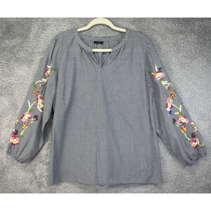 Talbots Womens Top 1X Petit Gray White Striped Floral Embroidered V-Neck Boho