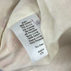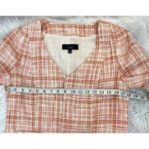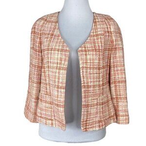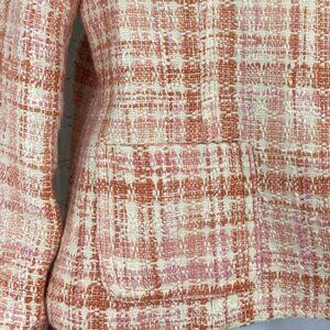 Talbots size 6 blazer, it has an open front, thick tweed fabric, plaid white, pink and coral color, Gracie Y2K (11/2010) style, shoulder padding, lined, front open patch pockets, collarless v-neck, long sleeves, double back vents and crop mid-waist fit. Materials shell 56% cotton, 17% acrylic, 14% viscose, 9% hemp, 4% polyester, lining 100% cotton, sleeve 100% polyester. Care dry clean only. MA2414 MFSR$189.00 Condition is preloved very good as shown in pictures. Please preview the measurements to ensure fit.
