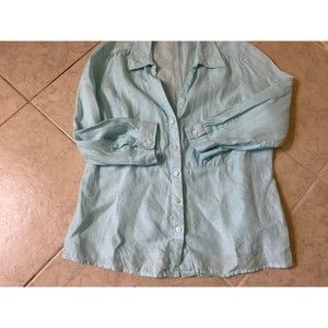 Talbots Womens 100% Pure Irish Linen Robins egg blue sz. 14 flattering fit with v neck button up. Please look at all pictures for condition details /sizing and ask questions before purchase. Pictures look different color under different lighting. Smoke free home.
