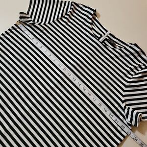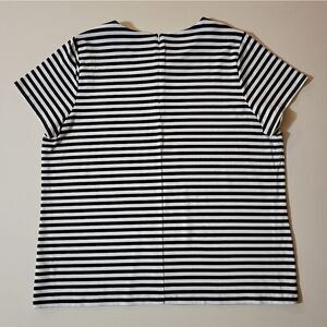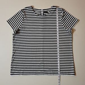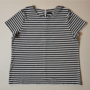 An everyday wardrobe staple in a timeless stripe print. Talbots' top is designed with a round neck and short sleeves. They're famous for the easy-care, easy-wear, jersey fabric! Perfect dressed up for the office or casual with white or black denim. Size label is missing but measures an XL - please consider all measurements provided prior to purchase. Excellent condition.