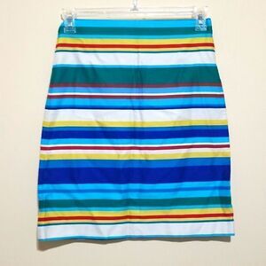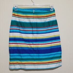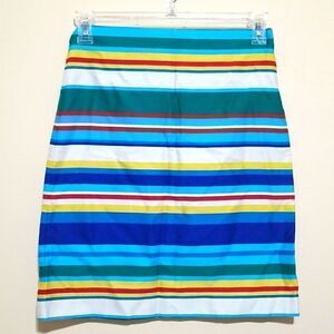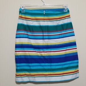 Preowned Talbots Womens Pencil Skirt Petite Blue Yellow Red Striped Bright Bold color in excellent condition with Zipper Closure.