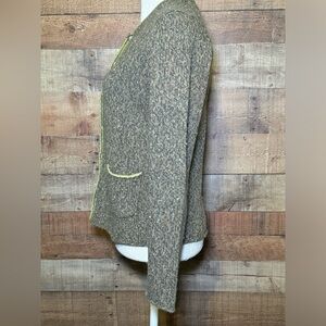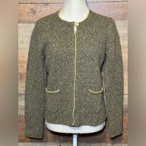 Talbots knit long sleeve, snap button front, cardigan sweater. Women's size Small. Features two front patch pockets and a hidden snap front closure. Wool, Angora rabbit and nylon blend. Olive green with multicolored speckles throughout and chartreuse outline on pockets and front. Tweed-like look. Pre-owned great condition.