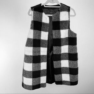 Talbots Wool Blend Buffalo Plaid Black White and Gray Open Front Vest Faux Fur