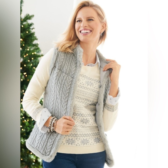Talbots Wool Blend Cable knit Sweater Vest Faux Fur Metallic Lining SZ SP