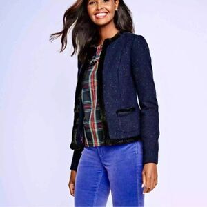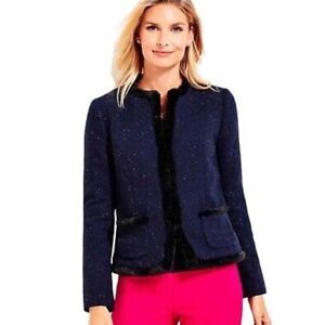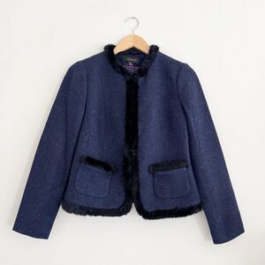 Talbots Faux Fur Trimmed Navy Speckled Wool Blend Jacket Blazer