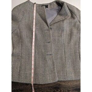 This Talbots jacket is a must-have for any wardrobe. The gray wool blend tweed fabric gives it a classic and preppy feel, perfect for any occasion, whether it be casual or for business. The jacket features a button closure and a short length, making it easy to wear and layer over any outfit.