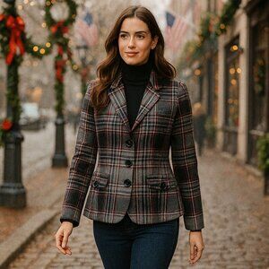 This Talbots Wool Blend Plaid Blazer (Size 14) delivers timeless charm with its red, gray, and black plaid pattern and bold red satin lining. Perfect for chilly days, this tailored jacket offers structure and sophistication for both office and casual looks.
