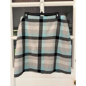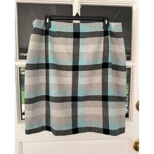 Talbots Wool Blend Skirt Size 14p Aqua Gray Plaid Lined Straight Pencil