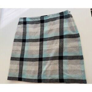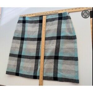 The Talbots Wool Blend Skirt in size 14P is a stylish and versatile piece perfect for the fall season. The aqua and gray plaid pattern adds a touch of preppy charm, while the straight pencil style gives it a classic and sophisticated look. This skirt is lined and features a slit and zipper closure, making it suitable for a business occasion or a holiday-themed event. Crafted from a wool blend tweed fabric, it is designed for petites and should be dry cleaned only to maintain its quality.
