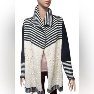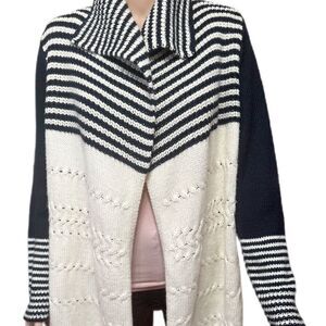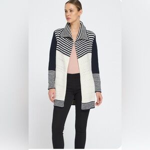 Talbots Wool Blend Womens Cardigan M Blue Ivory Striped Open Front Sweater