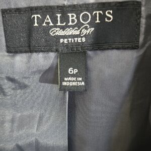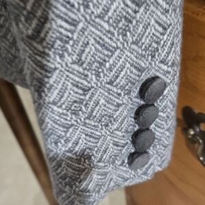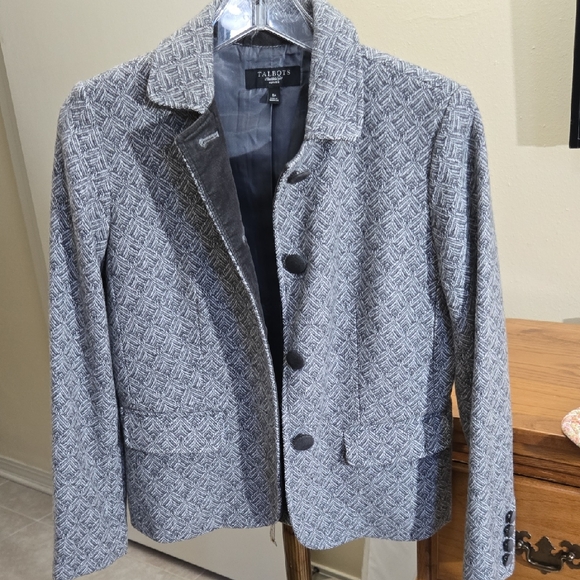 Elegant charcoal jacket by Talbots. Features textured pattern and button front. Super warm 70% wool!!