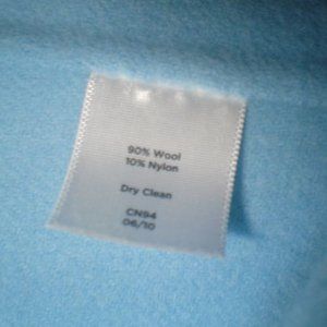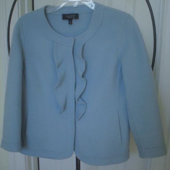Lovely Talbot's Jacket in a soft blue wool fabric. Size 8. Item is pre-owned and in very nice condition. Three snap closures, ruffle front, pockets. Feel free to ask any questions...I'm happy to help!
