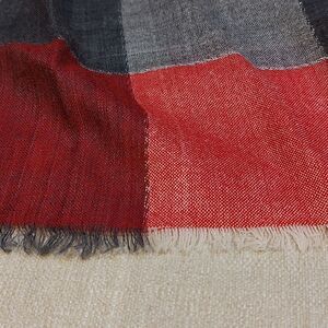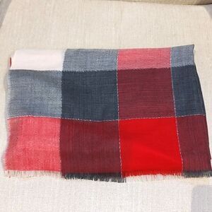 Talbot's Wool Red, Gray, and White Buffalo Check Scarf Wrap. This scarf features a self fringe on each end and silver metallic threads that frame each colored square. Super soft and lightweight 98% wool, 1% metallic threads and 1% other fibers.