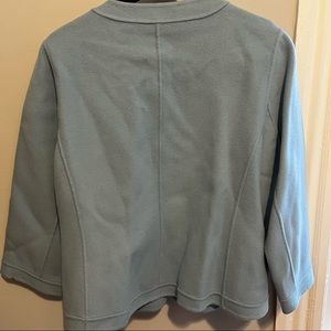 Talbots Pastel Blue Ruffle Front Wool Jacket The Grace Fit Snap buttons down the front with ruffle detail on either side. Front pockets. 3/4 length sleeves.