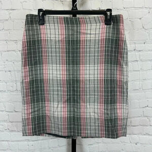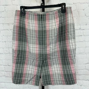 Talbots skirt size 8. Pink, red and gray plaid straight skirt. Wool/viscose/polyester blend. Skirt is lined and has a small slit on the back. Good condition. Smoke free home.
