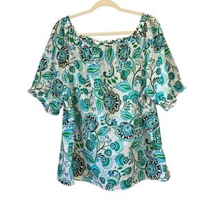 Painterly blooms dance across this charming blouse, creating a vibrant statement piece for your wardrobe. The delightful floral print, in shades of turquoise and green is set against a crisp white backdrop, offering a fresh and airy feel. A ruffled neckline adds a touch of feminine flair, while the short sleeves with ruffled cuffs provide a comfortable and stylish fit. The lightweight fabric drapes beautifully, making it perfect for warm weather days. This top is ideal for a casual brunch with friends, a relaxed afternoon of shopping, or a sunny vacation getaway. Measurements: • Length: 27 inches • Sleeve Length: 12 inches Color: Multicolor Type: Blouse Department: Women Style: Tunic Material: 100% Cotton Neckline: Square Neck Sleeve Length: Short Sleeve Sleeve Type: Casual Sleeve Accents: Ruffle Pattern: Floral Features: Lightweight, Ruffle Neckline, All Seasons, Breathable, Easy Care Fit: Regular Keywords: Talbots, Floral Blouse, Ruffle Neck, Breathable, lightweight, airy, Short Sleeve Top, XL, Extra Large, Bohemian, Boho, Casual Top, Summer Blouse, Cotton Blouse, Womens Top, Floral Print, Ruffle Sleeve