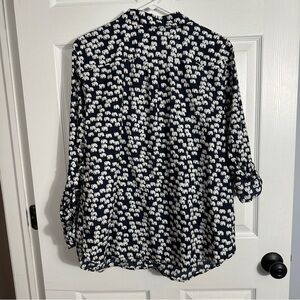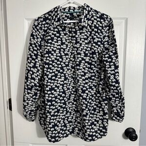 Talbots navy blouse with white elephant print. Size XL. 100% cotton, rollable long sleeves with tab to hold them at 3/4 length.