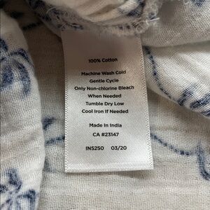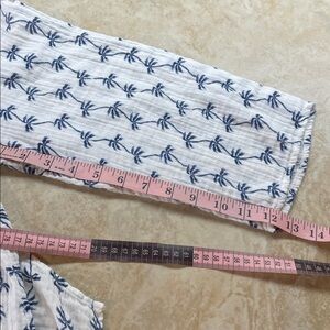 Talbots 100% cotton button down shirt in white with navy blue embroidered palm tree print. Lightweight semi-sheer woven fabric, chest pocket, side pockets, roll tab sleeves, and relaxed fit. Perfect for resort wear, beach vacations, or casual summer outfits. Made in India. Style INS250, dated 03/20. Pre-owned in good condition.