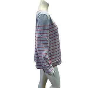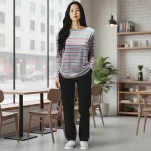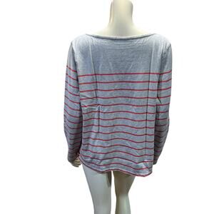 The tee showcases horizontal stripes, making it perfect for the holiday season or cozy winter days. Crafted from soft and breathable fabric, this short-sleeve top combines comfort and style effortlessly. Displayed on a mannequin wearing a size 6, this shirt best fits a modern XL (16-18).
