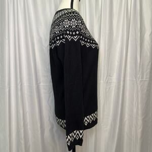Cozy up in this classic Talbots black and white Fair Isle sweater in size XS. Features a striking Nordic-inspired geometric yoke pattern, with matching detailing on the cuffs and hem. Made from a soft and breathable cotton blend (57% cotton, 28% acrylic, 15% polyester) for comfortable everyday wear. Crew neckline and long sleeves with ribbed trim add a timeless winter-ready touch. Gently worn and in excellent condition.