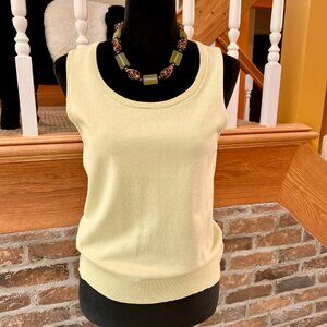 Beautiful shell and sweater set! Classic style that can go anywhere - dress it up or keep it casual. The color is hard to describe - yellow with slight green tint to it but neutral.