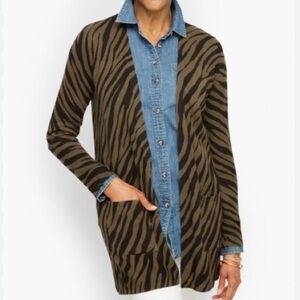 Talbots open-front cardigan featuring a chic zebra print. Crafted from a comfortable linen-cotton blend. Lightweight layering piece.