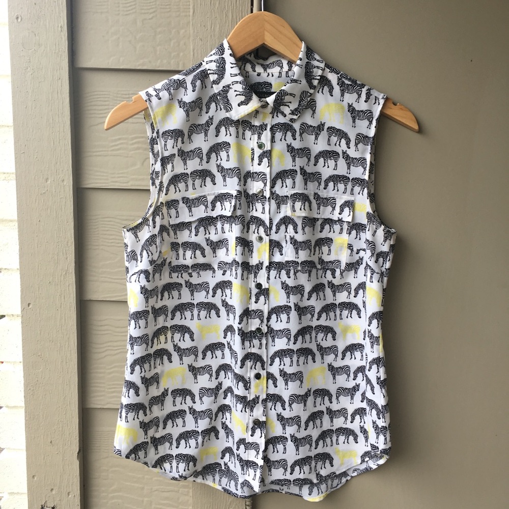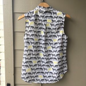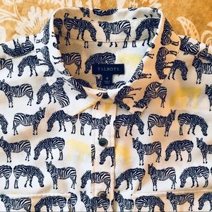 Talbot’s zebra sleeveless, button down top. Collared. White, black, yellow. Approx 21” wide at the bottom and 14” across the shoulders. Approx 23” down the front (collar to bottom). Perfect condition and super cute on!