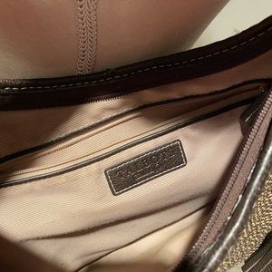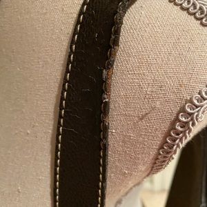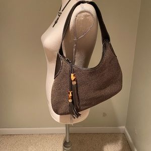 Talbots brown and black woven straw summer bag. Cute side tassels. 14”W X 8” H - with 9” drip from middle of handle. Gently worn, some wear & tear around handles (see photos). Inside zippered pocket.