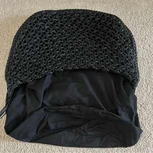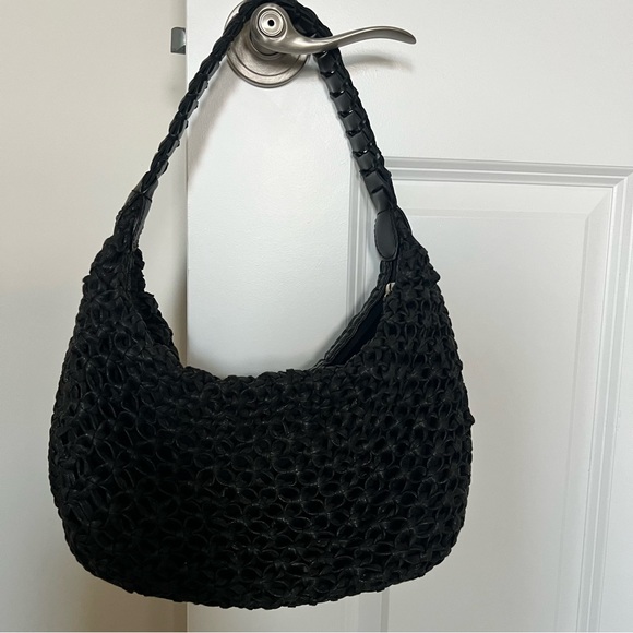 Talbots black bag, single woven leather strap, black cloth interior, zip pocket, strap drop-12”
