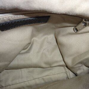 zipper top closure, front turn lock pocket, silver tone hardware, inside has 1 zip pocket & 2 slit pockets