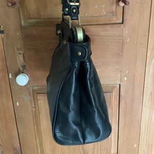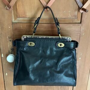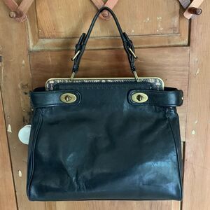 Talbots black cow leather satchel handbag with brass hardware and snakeskin leather and top handle with buckle. Has straps on sides with turnlock opening to front and rear compartments. Interior has beige lining. One compartment has a pocket and cell phone pocket with snap and rear compartment has zipper pocket. Beautiful tailored cut bag with a vintage structure and top brass U plate. Pristine condition.