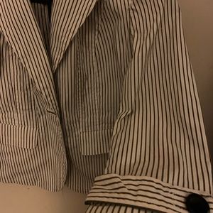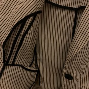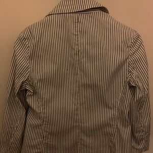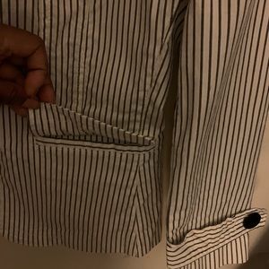 Described is this Talbots pinstripe blazer detailing a nice big stylish button in the front very well crafted and made... two pockets to the front sides seams throughout to give a nice flattering shape. 98% cotton and 2 %stretch Lycra spandex. Please view pics ask questions enjoy and thank you 😊