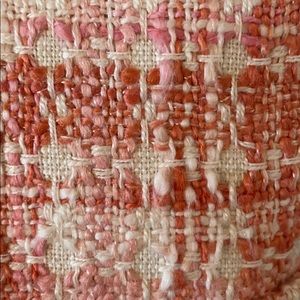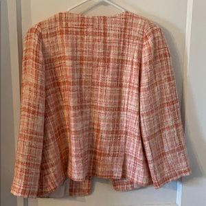 Gorgeous peach, ivory, and pink tweed blazer with a hint of silver woven through. Hits at high hip with 3/4 sleeves. Only worn to a couple of job interviews.