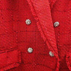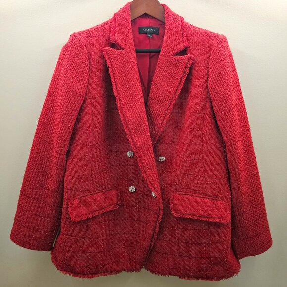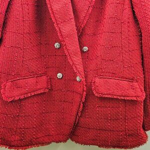 Talbots red blazer, with metallic thread embellished buttons and frayed hem, pockets, and collar. Material: 83% polyester, 11% wool, 1% metallic, 5% other fibers.