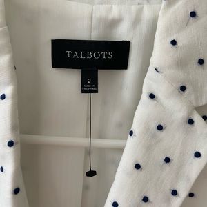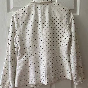 An elegant blazer with polka dot print, can be worn semi chic, or formal, depends on the occasion. The dots are navy blue, the jacket is white. Size 2 never worn.