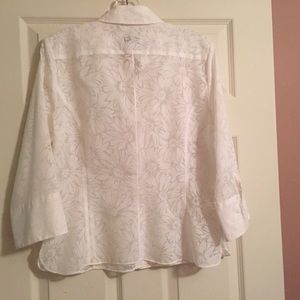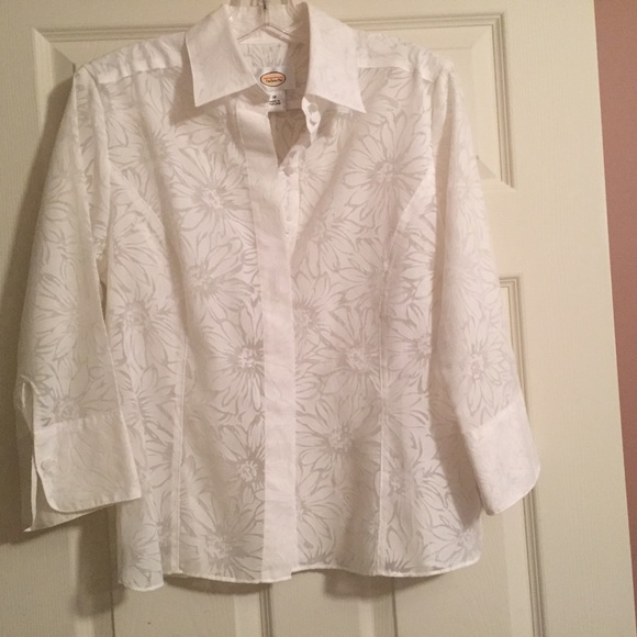 Talbots LIKE NEW size 10 blouse. White tone-on-tone flowers on a see-through fabric. Three back seams and two front seams, front buttons hidden behind a placket. Fabric is 55% polyester 45% cotton.