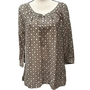 Talbots blouse Brown and cream Clear embellishments on some of the circles Sheer Length 28” Pit to pit 20” 2-1/4 small side slits Sleeve inseam 12”