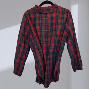 Great for Christmas! Classic Talbots blouse in a festive red, green, and navy plaid. Features a soft collar with subtle ruffle trim for a polished yet relaxed look. Lightweight and easy to wear — great for casual outfits, workwear, or layering under a sweater or blazer for a refined, timeless style.