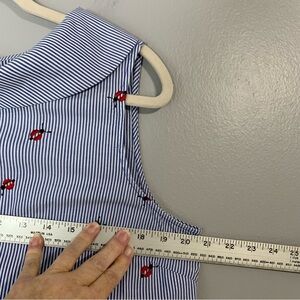 Talbots novelty ladybug popover blue and white striped sleeveless tunic blouse with curved side hem. Semi Jackie-O style cowl neckline. Two Covered button back closure. Size L