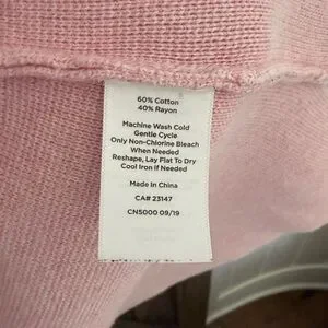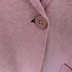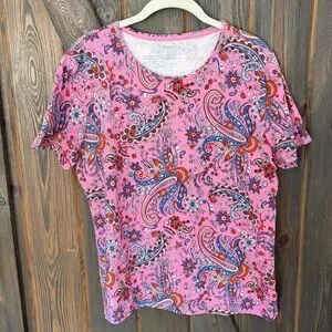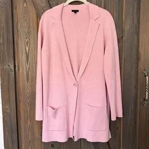 Talbots long pink cadigan and pink paisley crewneck tee. Cardigan has one button closure, notch neck collar and patch pockets.