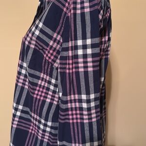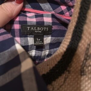 Ladies petite large Talbots button down, lightweight cotton, dark blue, pink, and white plaid like design