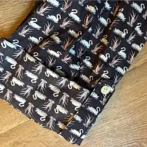 Women’s button down shirt with the option to roll/cuff in place the sleeves. Swan print on a navy background.