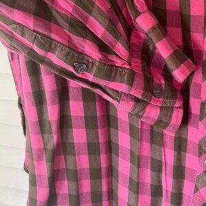 Talbots women's buttondown shirt, size XL. Pink and greyish-green plaid/check pattern. Rayon. Hand wash. Gently worn, in very good used condition. No rips or stains. See photos.