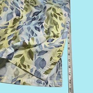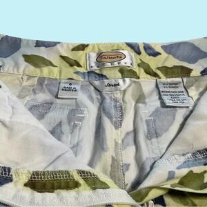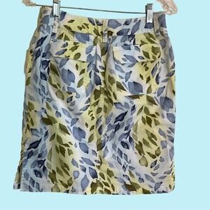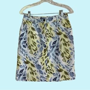 Talbots attractive jean style skirt. Multicolored print of blues, yellows and greens. Top zip front with button closure, belt loops and two flap pockets on back. Size 6 petite. Slight stretch to fabric. From nonsmoking home.