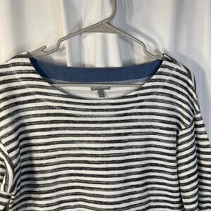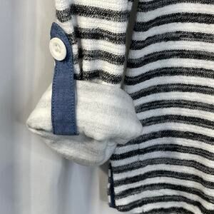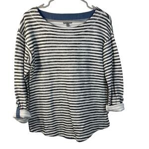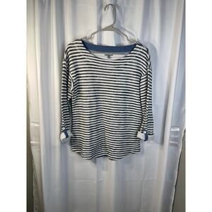 T by Talbots knit shirt tee t-shirt blouse top women’s size small gray-blue white striped boat neck rounded hem split hem long sleeve with roll tabs to be worn long or ¾ sleeves if preferred – material is slightly nubby knit, very comfortable for year round wear