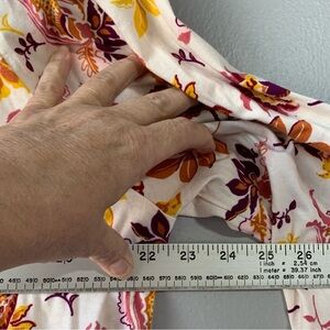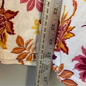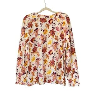 Talbots cotton cream/ivory split crewneck top with ruffle trim and Fall floral pattern in mauve, gold, pink and purple along with long sleeves with smocked wrists and shoulders. Great by itself or with a jacket! Tags: Fall, Winter, floral, smocked, layering, relaxed fit, comfortable, office, business casual, cottage core. EUC Size L