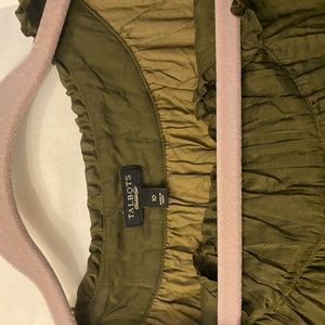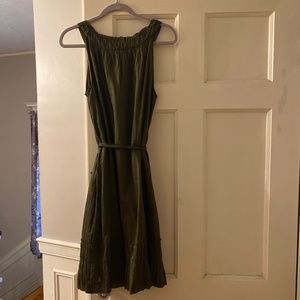 This dress is as light as a feather. Perfect for trip or vacation. Olive green color. Can be worn belted or without belt. Lined.
